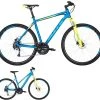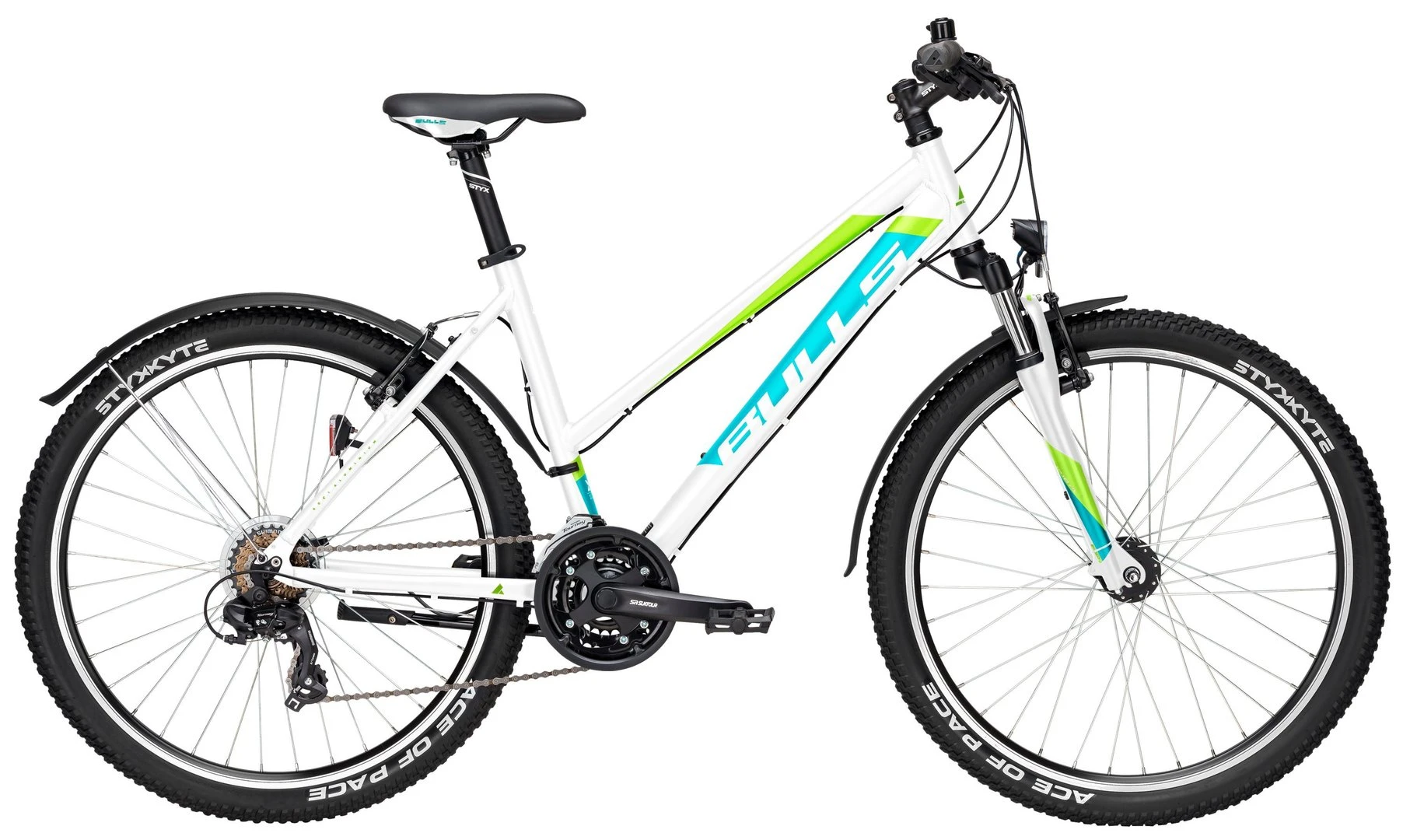 Alu-Rahmen, Suntour XCE-28 Federgabel einstellbar, 21-Gang Tourney Schaltung mit EZ-Fire Schalthebeln, Suntour XCC Tretlager, Nabendynamo, DBM-2 Hohlkammerfelgen, Tektro V-Bremsen, STYX Sattelstütze, Downhill-Lenker und Vorbau, 15 Lux LED-Lampe, Standrücklicht, Ständer, Schutzbleche