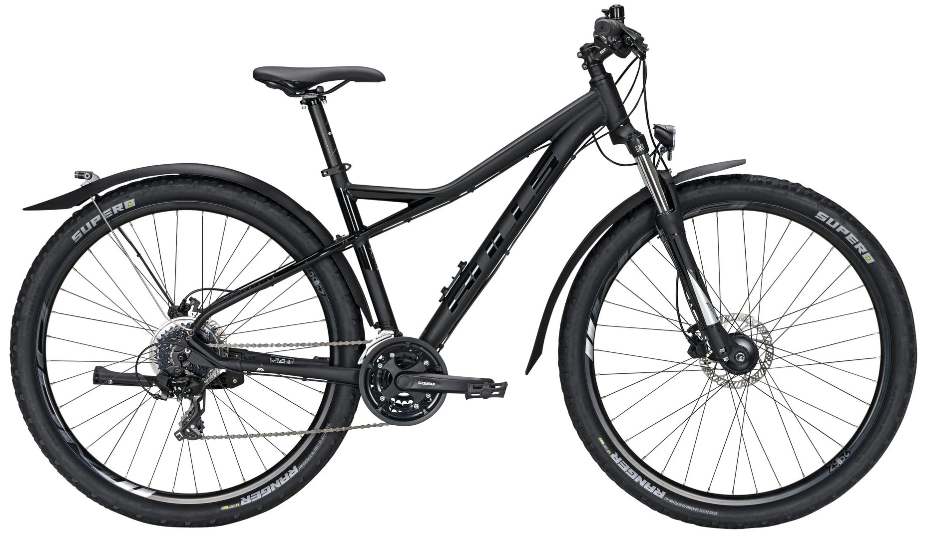 6061 Alu-Rahmen, Suntour XCT Federgabel einstellbar, 24-Gang Altus Schaltung und Schalthebel, Tourney Umwerfer, STYX Kurbeln, Nabendynamo, DDM-2 Hohlkammer-Felgen, Tektro HD-M275 Disc-Bremsen, STYX SattelstĂŒtze, Downhill-Lenker und Vorbau, 30 Lux LED-Lampe, StandrĂŒcklicht, Hinterbau-StĂ€nder, Schutzbleche