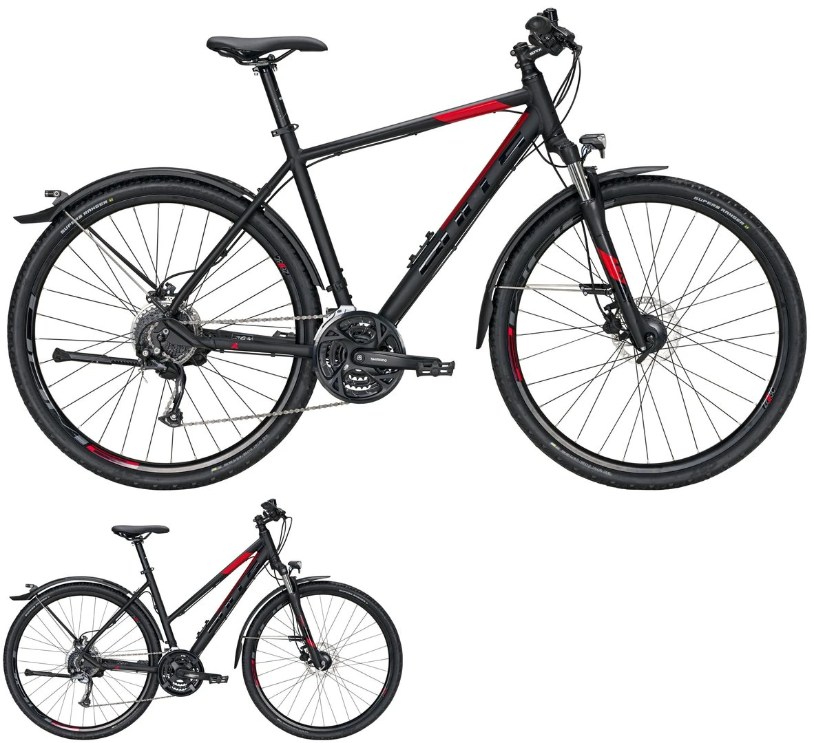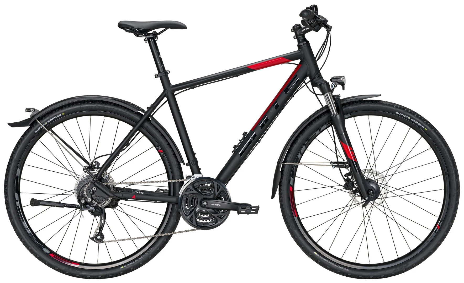 7005-Alu-Biaxial-Rahmen, Suntour NVX Federgabel einstellbar, 27-Gang Shimano Altus Schaltwerk, Schalthebel Umwerfer und Kurbeln, Tektro HD-T275 Disc-Bremsen, Bulls DDM-2 Disc Hohlkammerfelgen, DH-3D32 Nabendynamo, 50 Lux LED-Lampe mit Sensor und Standlicht, StandrĂŒcklicht hinten auf dem Schutzblech, SKS Velo 55 Steckbleche mit Streben, Pletscher Flex KSA-40 StĂ€nder