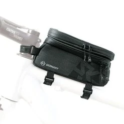 Dank der Klett-Unterseite kann die Handytasche einfach abgenommen werden. Mit robusten, gummierten Klettverschluss-Halterungen wird die Tasche gut erreichbar am Oberrohr befestigt. Zur Ausstattung gehören ebenfalls laminierte, wasserdichte ReiĂverschlĂŒsse mit ergonomischem EASYZIP, ĂŒbersichtliche Innentaschen und orangefarbenes Innenfutter zum leichteren Finden der Utensilien.